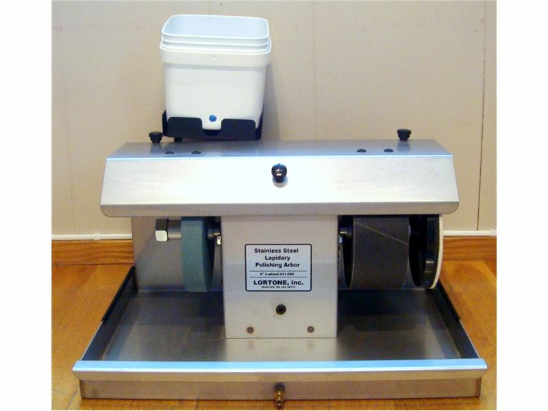 Lortone slipemaskiner med kasse og aksling laget i rustfritt stål. Maskinene kommer i 2 størrelser, som passer til 6» eller 8» sliprhjul. De lages med enten kort aksel med plass til 2 slipehjul + endeplate, eller med lang aksel som har plass til 4 slipeskiver og endeplate. de kan brukes med diamant eller silisiumkarbid slipehjul.