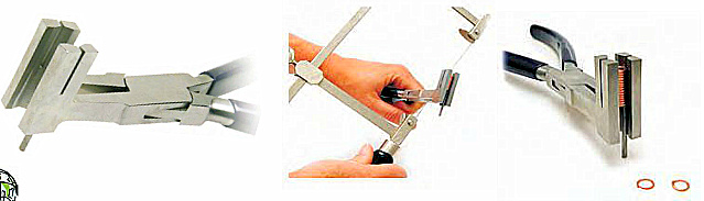 En tang for å holde trådspiralen mens man sager opp øsknene. Kjevene på tangen har spor for sagbladet.