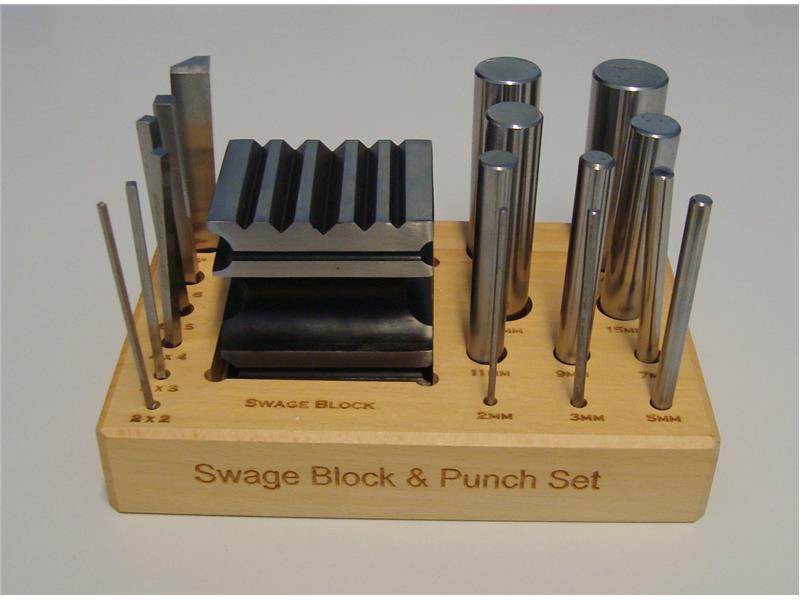 Art. 110598 Rilleanke med blokk og 17 pundsler. Runde pundsler i str. 2, 3, 5, 7,9, 11, 15, 18, 21 og 24mm. Firkantt 2×2 , 3×3, 4×4, 5×5, og 6x6mm, samt en pundsel for 45 grader vinkel.