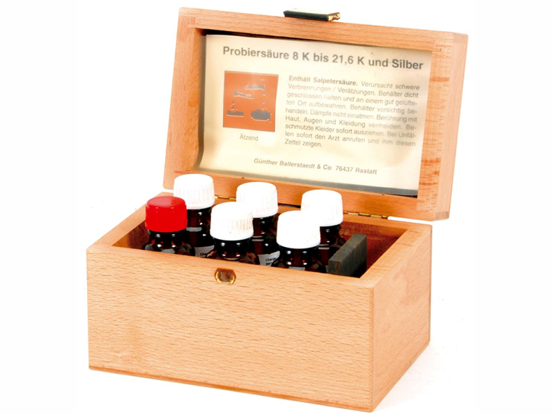 Art. 230050 Prøvesyresett. Leveres i treeske. Til sølv, samt 8, 14, 18 og 21,6 karat gull. Med prøvestein og én flaske kontrasol .