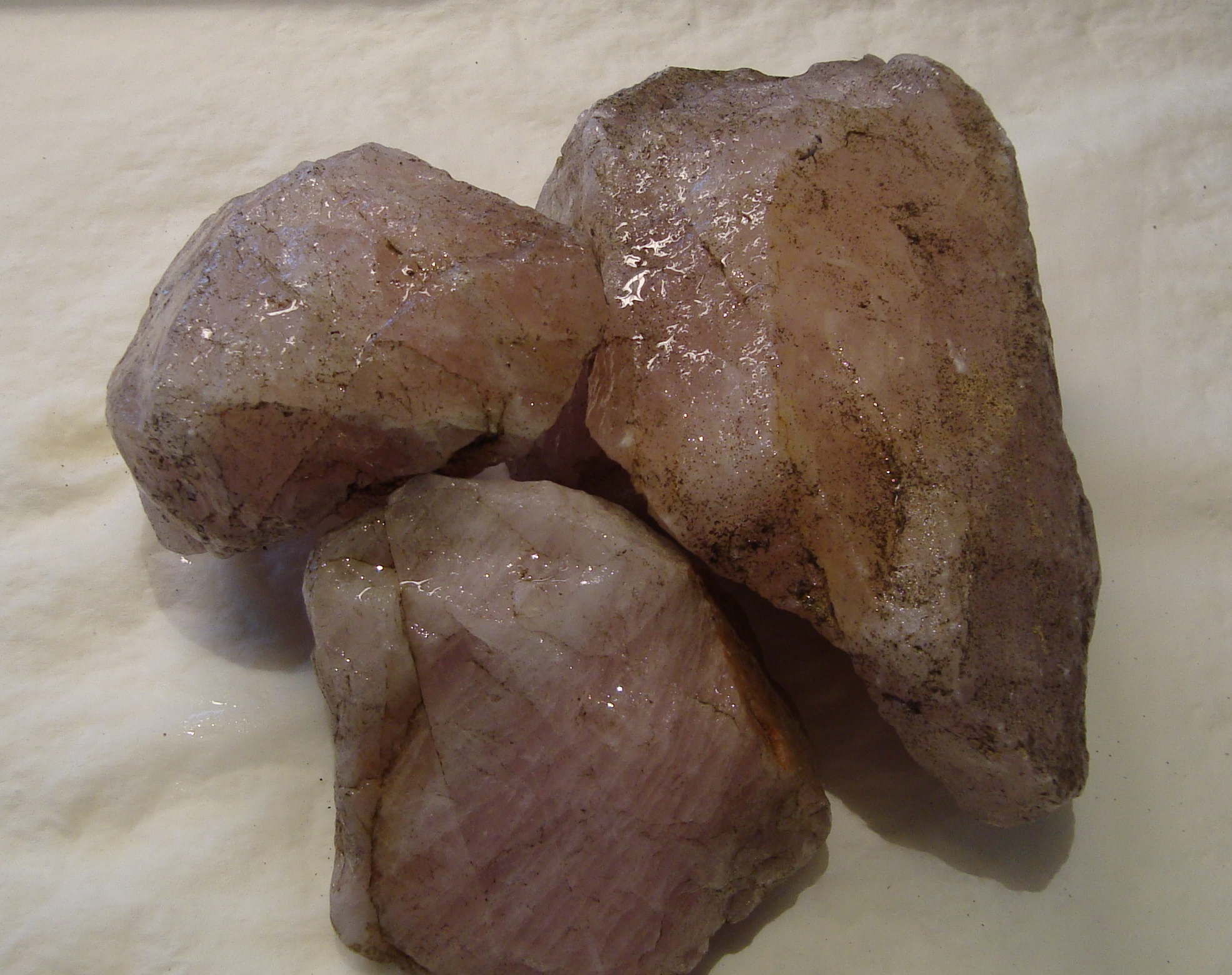 Rosenkvarts. Størrelse på bitene, 370 – 1500 gram. Prisen er oppgitt pr. 100 gram.